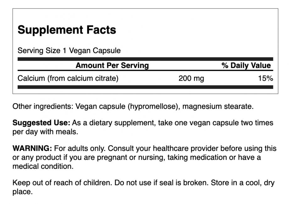 | Calcium (from calcium citrate) | 200 mg | 15% |