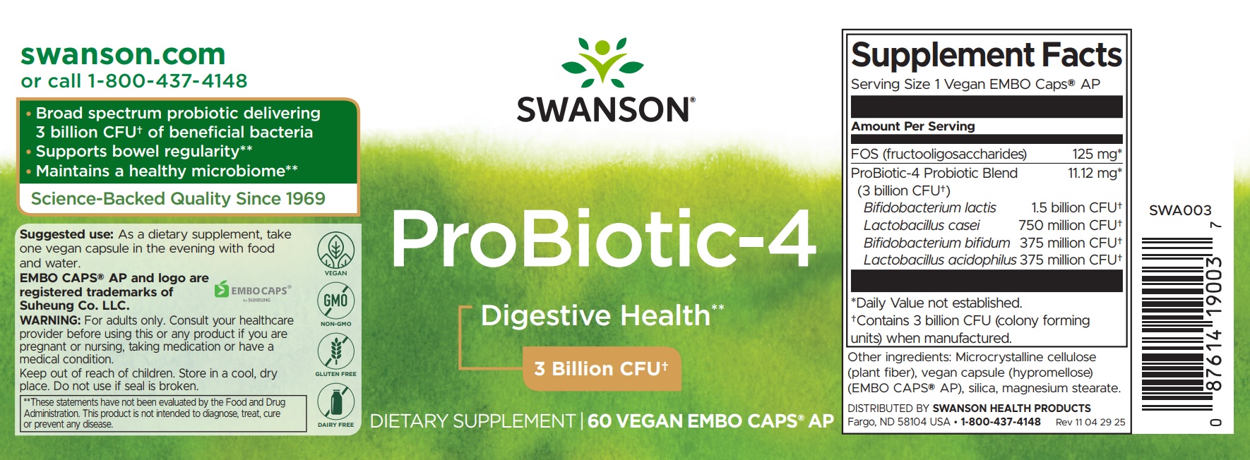 Swanson Probiotic-4 hat ein breites Spektrum und liefert 3 Milliarden lebensfähige Organismen von nützlichen Bakterien aus vier ausgewählten Stämmen, Lactococcuslactis, Lactobacilluscasei, Lactobacillusacidophilus und Bifidobacteriumbifidum einschließlich - alles in bequemen, einfach zu nehmen vegetarischen Kapseln.