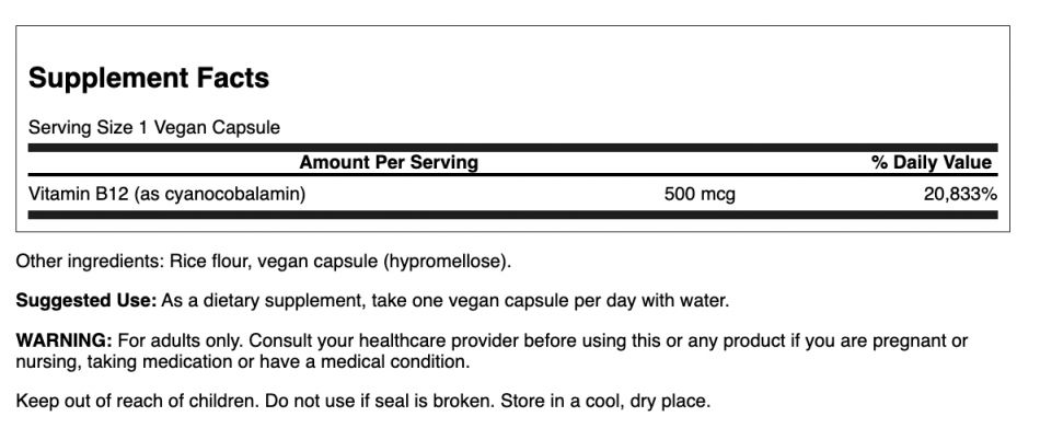 | Vitamin B-12 USP (as cyanocobalamin) | 500 mcg | 20,833% |