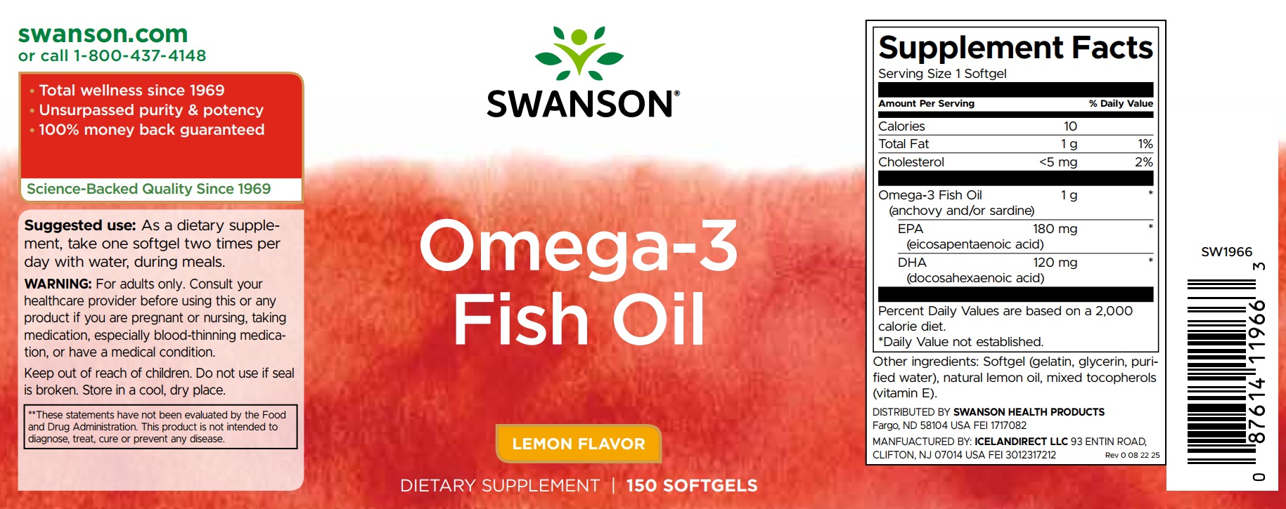 Swanson Lemon Flavour Omega-3 Fish Oil includes molecularly distilled fish oil with lemon flavour. Each softgel delivers 180 mg of EPA and 120 mg of DHA. You can compare the product with other brands' offers, but we guarantee you'll get the same or better quality at a bargain price. Now you can savour this new fish oil with fresh lemon taste which retains the same nutritional qualities.