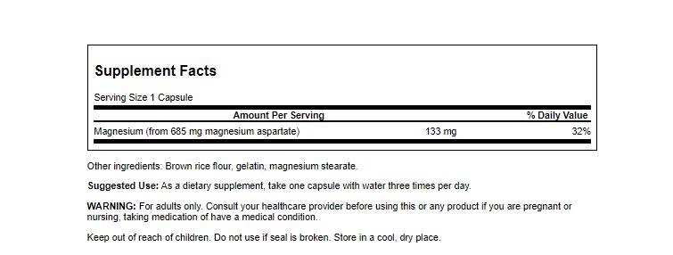 | Magnesium (from 685 mg magnesium aspartate) | 133 mg | 32% |