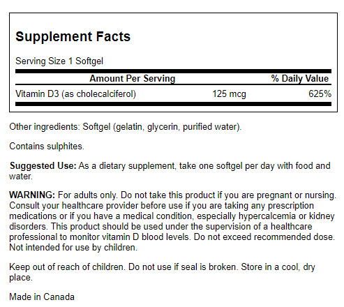 • Swanson Premium Puissance Élevée en vitamine D-3 5000 UI. 5000 D3 UI par gélule.