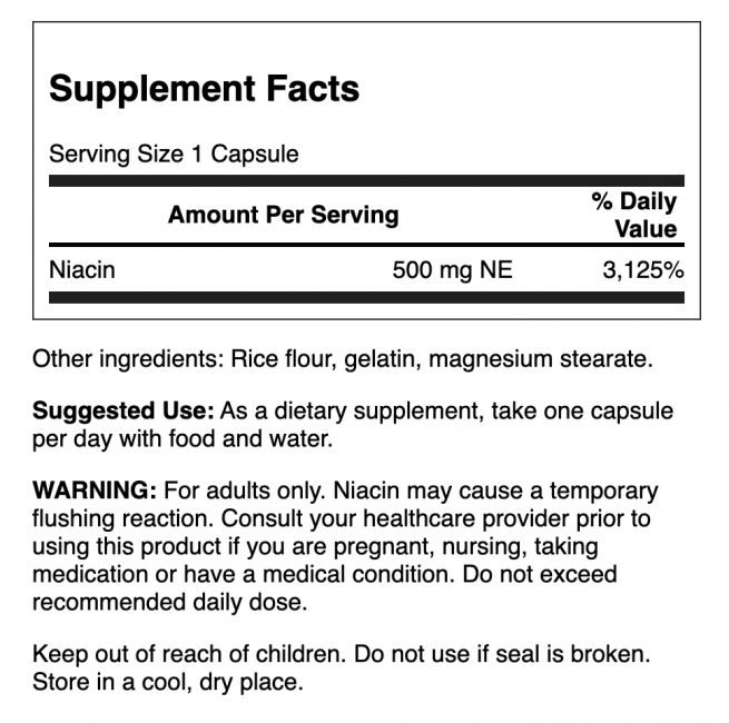La niacina di Swanson è una vitamina fondamentale per il mantenimento del sistema cardio-vascolare, la quale mantiene anche i livelli sani dei lipidi. Inoltre essa promuove il metabolismo dei carboidrati, aiutando cosi’ la carica di tutto il corpo con l’energia. Le nostre capsule, altamente efficaci, forniscono all’organismo 500mg di niacina, il che è un modo comodissimo di avere dei livelli sani di niacina tutti i giorni.