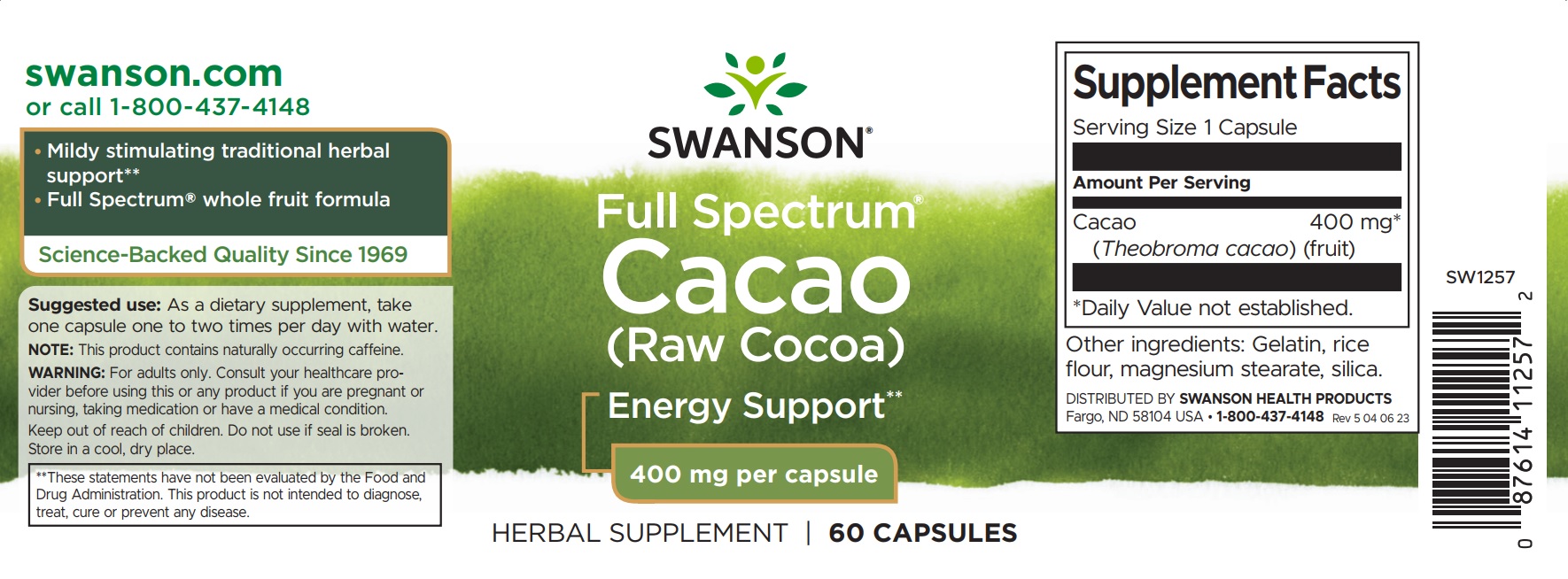 Did you know that cocoa is actually good for you? Swanson Full Spectrum® Cacao is raw cocoa at its best. This mildly stimulating traditional herb is now available in an easy to take capsule. Get all the health benefits of raw cocoa without feeling any of the guilt... not that you should anyway!