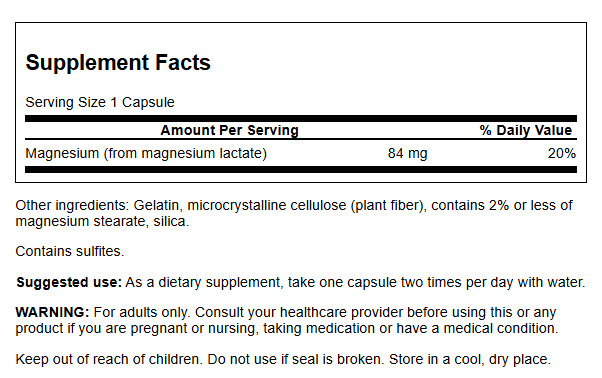 Mineral supplements come in many forms, and lactates are among the most commonly recommended. Contrary to popular perception, mineral lactates are lactose free, formed by uniting the mineral itself with lactic acid. Compared to other forms, lactates contain a smaller percentage of elemental minerals but are often better tolerated and easier on the stomach. Swanson Premium Brand® Magnesium Lactate is gentle on the system and delivers 84 mg of elemental magnesium per capsule, perfect for those who need just a little more of this important mineral to shore up daily intake.