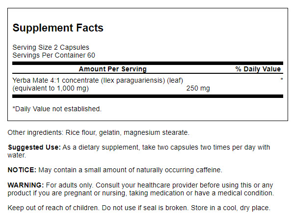 | Yerba Mate 4:1 concentrate (Ilex paraguariensis) (leaf) (equivalent to 1,000 mg) | 250 mg | * |