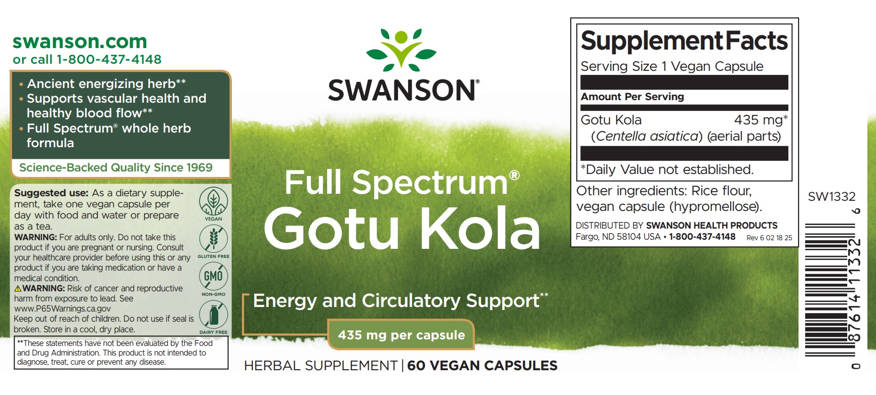 Gotu Kola von Swanson ist ein pflanzliches belebendes Mittel für das Gehirn und den Körper. Jahrhundertelang von Ayurveda-Experten als Stärkungsmittel für das Gedächtnis verwendet, ist diese asiatische Heilpflanze jetzt auf der ganzen Welt beliebt, da sie auf eine natürliche Art und Weise die gesunde Durchblutung fördert und somit die allgemeine Vitalität steigert. Jede Kapsel enthält 435 mg reines Gotu-Kola-Pulver.