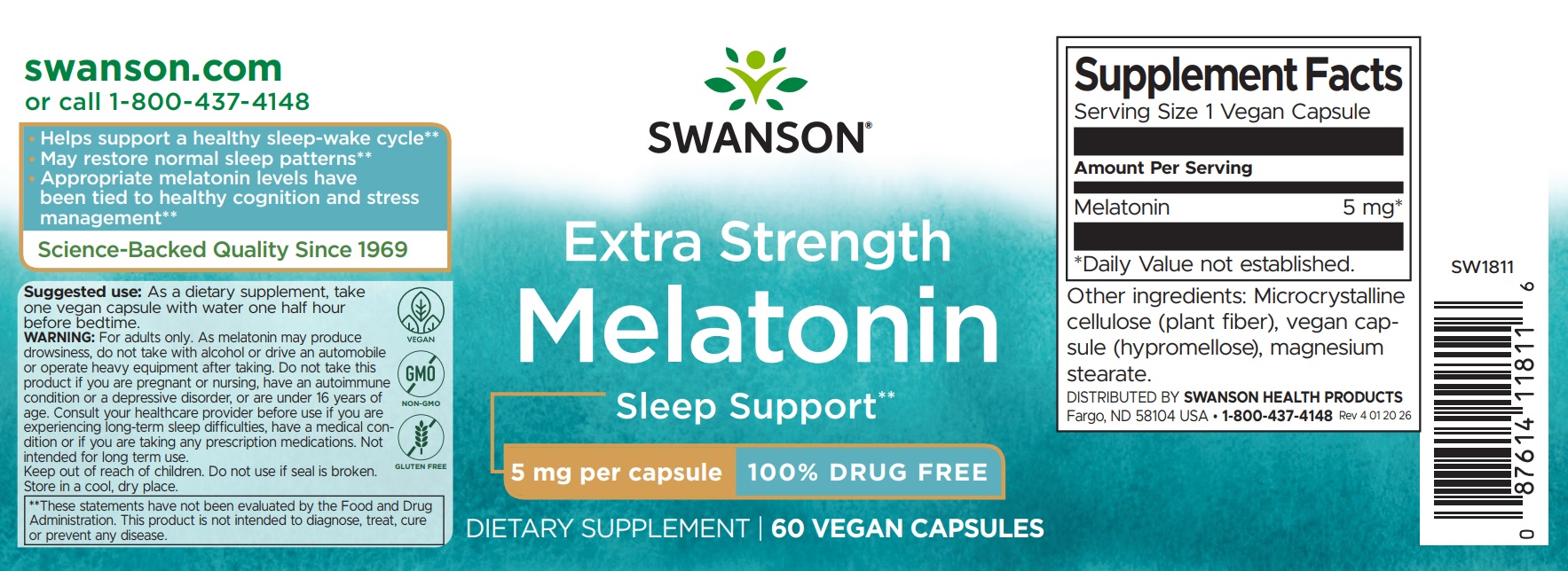 Are the Zzzs you need eluding you? Get your sleep-wake schedule back on track with Swanson Extra Strength Melatonin. Each capsule delivers a potent 5 mg melatonin to help restore normal sleep patterns. So what is melatonin? It is a hormone naturally produced by the pineal gland that signals the body when it is time to sleep. Unfortunately that production can be disrupted by multiple factors, including age, travel, shift work and more. Adding a melatonin supplement to your nighttime routine can help support healthy levels in the body so you can get the restorative sleep you need. As an antioxidant, it also works to protect the body from free radicals, notably the eyes where it may offer protection for retinal health. Appropriate melatonin levels have also been tied to healthy cognition and stress management.