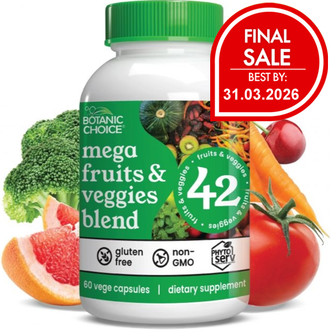Mom was right when she told you to eat your fruits and veggies, wasn't she? Well, unfortunately, most of us don't get anywhere near what we need, and that's where our Mega Fruits & Veggies Blend comes in. The reality is that it's just about impossible to get the recommended 5-9 servings a day. You'd be doing nothing but eating all day! Simple, fast, convenient Now it's simpler than ever to get important nutrients from vegetables and fruits with our turbocharged Mega Fruits & Veggies Blend. Each daily serving is chock-full of antioxidants and nutrition in easy-to-swallow capsules. Talk about convenient! Gluten-free and Non-GMO too so no worries there. When you give your body the nutrition it needs, you feel your best to charge through your day. Whether that's another lap around the pool, power shopping with friends, or enjoying kids and grandkids, good nutrition from our Mega Fruits & Veggies Blend can make all the difference in your life. Power-packed with natural goodness You get nutrients from 42 different fruits and vegetables including: blueberry, cranberry, grapeseed, strawberry, raspberry, pomegranate, bilberry, alfalfa, carrot, broccoli, apple, black cherry, celery, artichoke, spirulina, elderberry, spinach, tart cherry, papaya and much more. Imagine how hard it would be to eat all that every day! Compare and save No need to break the bank to stay healthy. Compare our ingredients, milligrams, and cost with other nationally advertised brands and you'll see our Mega Fruits & Veggies Blend is equal to or better than anything else you'll find. Plus only 2 capsules a day, not 6! It simply can't be beat! The secret to wellness in an easy-to-swallow capsule! Make sure your daily nutritional bases are covered with our all-inclusive Mega Fruits & Veggies Blend. Try it now!