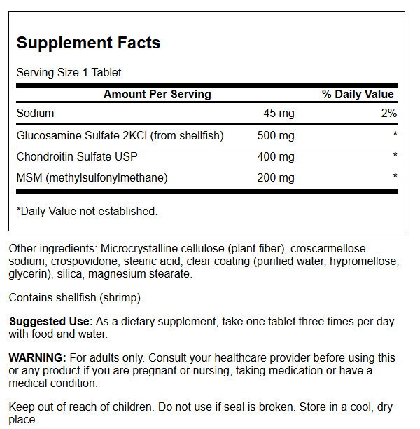 Swanson Glucosamine, Chondroitin & MSM is a powerhouse formula dedicated to meet your joint health needs. This three-in-one formula combines the cartilage-building nutrition of glucosamine and chondroitin with the additional support of MSM (methylsulfonylmethane), a high-bioavailability source of organic sulfur, which is an essential mineral for tendons, ligaments and other vital joint tissues.