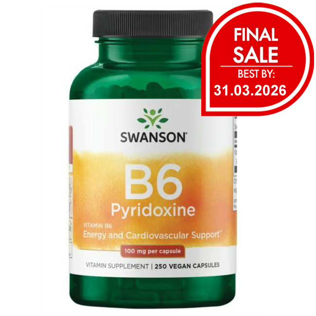 Swanson Vitamin B6 has many benefits in the body. For one, it supports the normal breakdown of carbohydrates, proteins and fats, playing an essential role in energy metabolism. It also works with folic acid and vitamin B12 to promote cardiovascular health. Each capsule delivers 100 mg of vitamin B6.