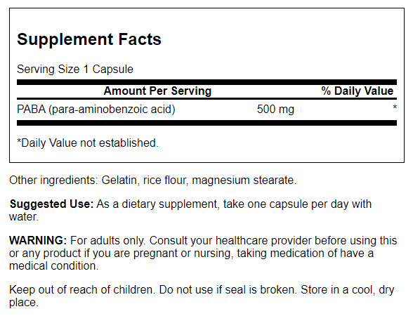 | PABA (para-aminobenzoic acid) | 500 mg | * |