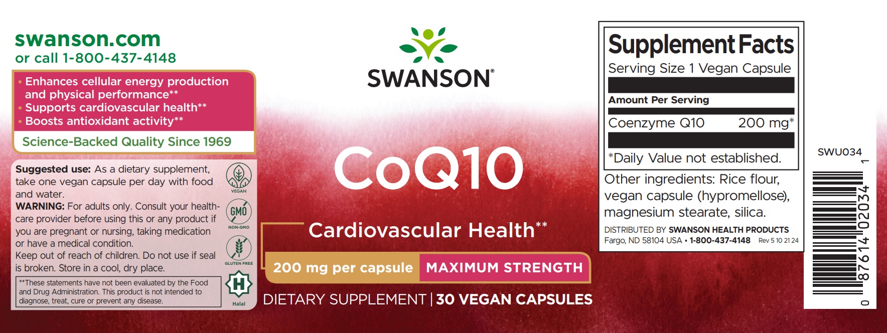 Il CoQ10 di Swanson è un ottimo modo per prendersi cura della salute del cuore. Chiamato anche ubiquinone, il CoQ10 è integrato nella produzione di adenosina trifosfato (ATP), la principale fonte di energia a livello cellulare. Ogni capsula fornisce 200 mg di CoQ10. Altri ingredienti: Farina di riso, Gelatina, Stearato di magnesio, Biossido di silicio. Uso consigliato: assumere una capsula al giorno con cibo e acqua.