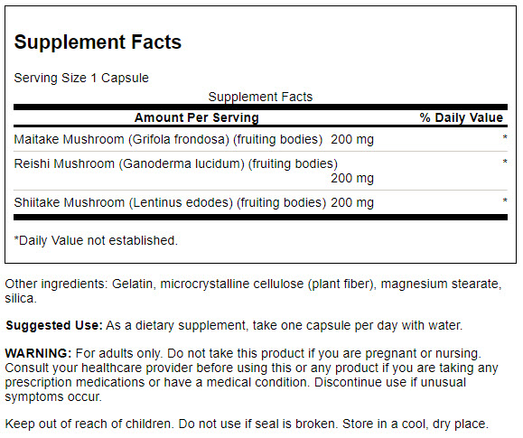 Like the other herbals in the Swanson Premium Full Spectrum line, our Triple Mushroom Complex dietary supplement is a 100% pure traditional herbal formula. Nothing fancy, just pure, high-quality, natural whole-herb Shiitake, Reishi and Maitake mushrooms at an affordable price...something you expect from Swanson Health Products. It is sourced from its native location, tested for purity and safety and manufactured under the strictest quality controls. Make the most of your immune system support efforts with Full Spectrum Triple Mushroom Complex.