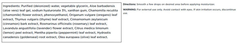 Ingredients: Purified (deionized) water, vegetable glycerin, Aloe barbadensis (aloe vera) leaf gel, sodium hyaluronate 3%, xanthan gum, Chamomilla recutita (chamomile) flower extract, phenoxyethanol, Origanum vulgare (oregano) leaf extract, Thymus vulgaris (thyme) leaf extract, Cinnamomum zeylanicum (cinnamon) bark extract, Rosmarinus officinalis (rosemary) leaf extract, Lavandula angustifolia (lavender) flower extract, Citrus medica limonum (lemon) peel extract, Mentha piperita (peppermint) leaf extract, Hydrastis canadensis (goldenseal) root extract, Olea europaea (olive) leaf extract.