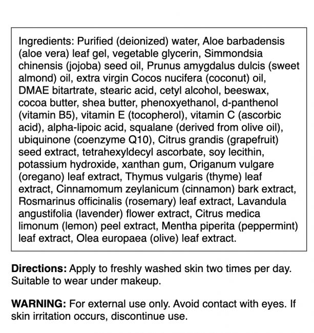 Ingredients: Purified (deionized) water, Aloe barbadensis (aloe vera) leaf gel, vegetable glycerin, Simmondsia chinensis (jojoba) seed oil, Prunus amygdalus dulcis (sweet almond) oil, extra virgin Cocos nucifera (coconut) oil, DMAE bitartrate, stearic acid, cetyl alcohol, beeswax, cocoa butter, shea butter, phenoxyethanol, d-panthenol (vitamin B-5), vitamin E (tocopherol), vitamin C (ascorbic acid), alpha-lipoic acid, squalane (derived from olive oil), ubiquinone (coenzyme Q10), Citrus grandis (grapefruit) seed extract, tetrahexyldecyl ascorbate, soy lecithin, potassium hydroxide, xanthan gum, Origanum vulgare (oregano) leaf extract, Thymus vulgaris (thyme) leaf extract, Cinnamomum zeylanicum (cinnamon) bark extract, Rosmarinus officinalis (rosemary) leaf extract, Lavandula angustifolia (lavender) flower extract, Citrus medica limonum (lemon) peel extract, Mentha piperita (peppermint) leaf extract, Hydrastis canadensis (goldenseal) root extract, Olea europaea (olive) leaf extract.