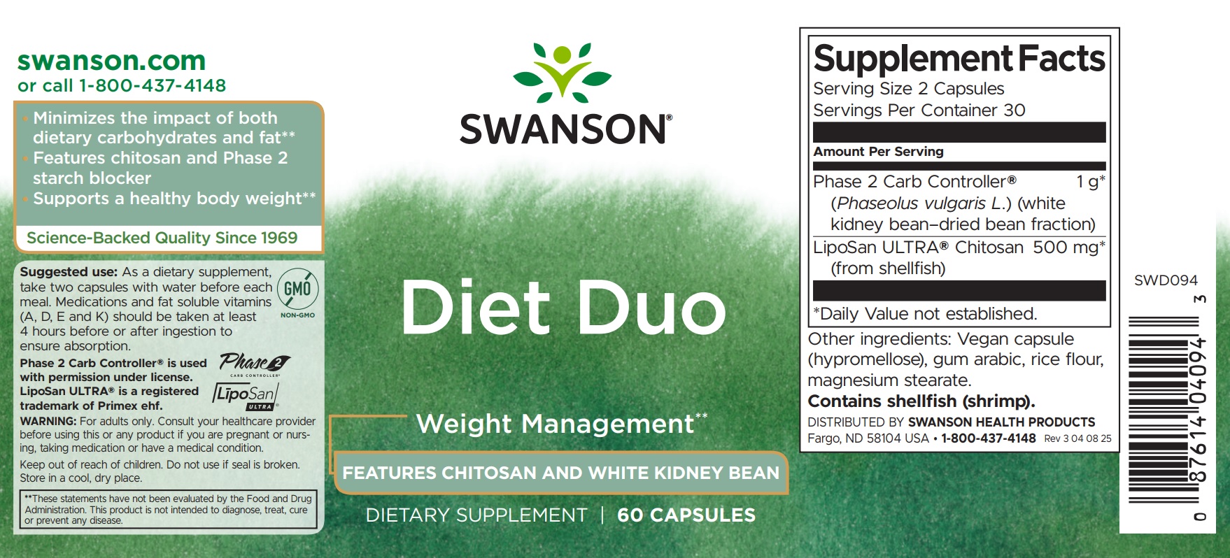 Now there's a formula that combines two of nature's most effective diet aids to minimize the impact of dietary carbs and fats. Swanson Diet Duo is a revolutionary formula that combines two research-backed ingredients: the fat-binding power of LipoSan ULTRA chitosan and the carb-control capabilities of Phase 2 starch blocker.