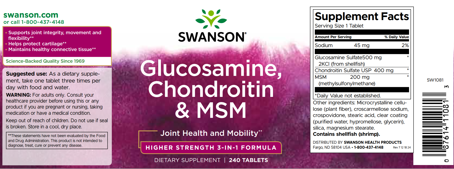Swanson Glucosamine, Chondroitin & MSM is a powerhouse formula dedicated to meet your joint health needs. This three-in-one formula combines the cartilage-building nutrition of glucosamine and chondroitin with the additional support of MSM (methylsulfonylmethane), a high-bioavailability source of organic sulfur, which is an essential mineral for tendons, ligaments and other vital joint tissues.