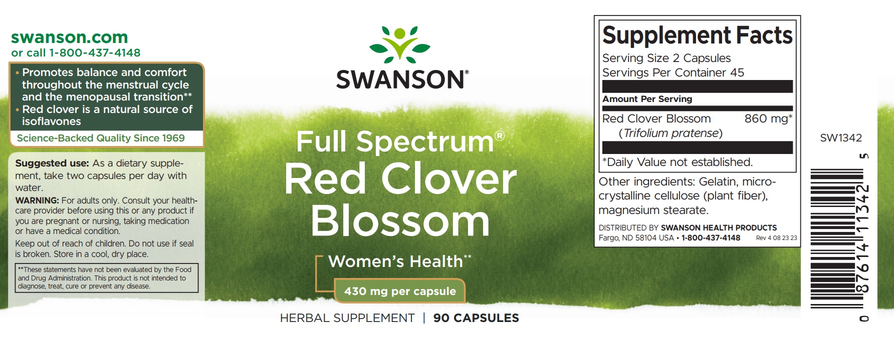 Swanson Full Spectrum Red Clover Blossom and Herb helps maintain emotional and physical wellbeing during and after menopause. Red clover, also known as trefoil, wild clover and purple clover, is found throughout North America, Europe and central and northern Asia.