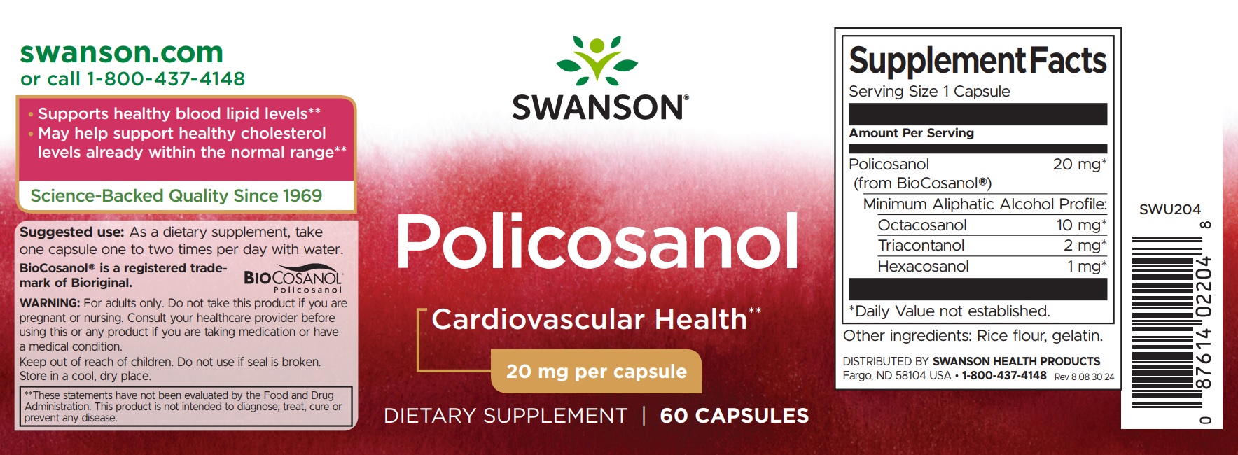 Don't take your heart health for granted—take control of your cardiovascular care with Swanson Policosanol. Derived from a sugarcane base, our BioCosanol® policosanol is recognized as the world's finest policosanol source, featuring the ideal ratios of octacosanol, triacontanol and hexacosanol for promoting heart-healthy lipid levels already within the normal range. Policosanol makes a great addition to a healthy diet and exercise program for everyday cardiovascular care.