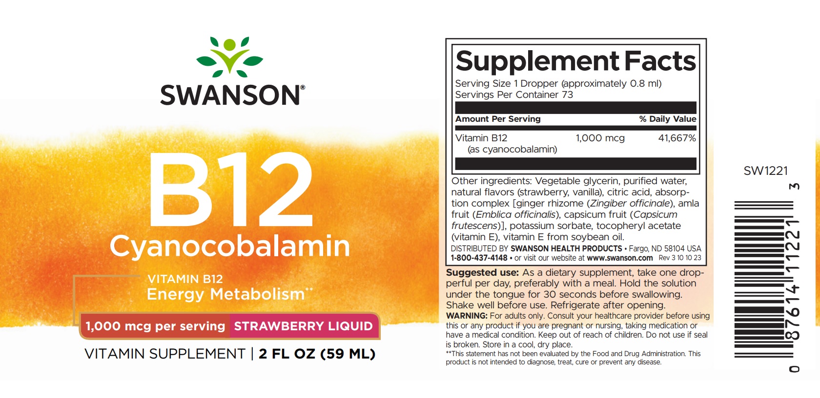 Swanson B12 Cyanocobalamin plays a vital role in the formation of red blood cells that deliver oxygen to all parts of the body, which supports energy levels. It also promotes cardiovascular health and has a delicious strawberry flavor.