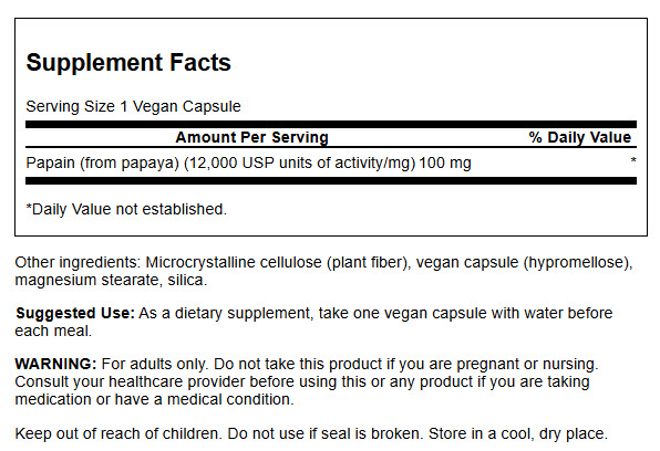 | Papain (from papaya) (12,000 USP units of activity/mg) | 100 mg | * |