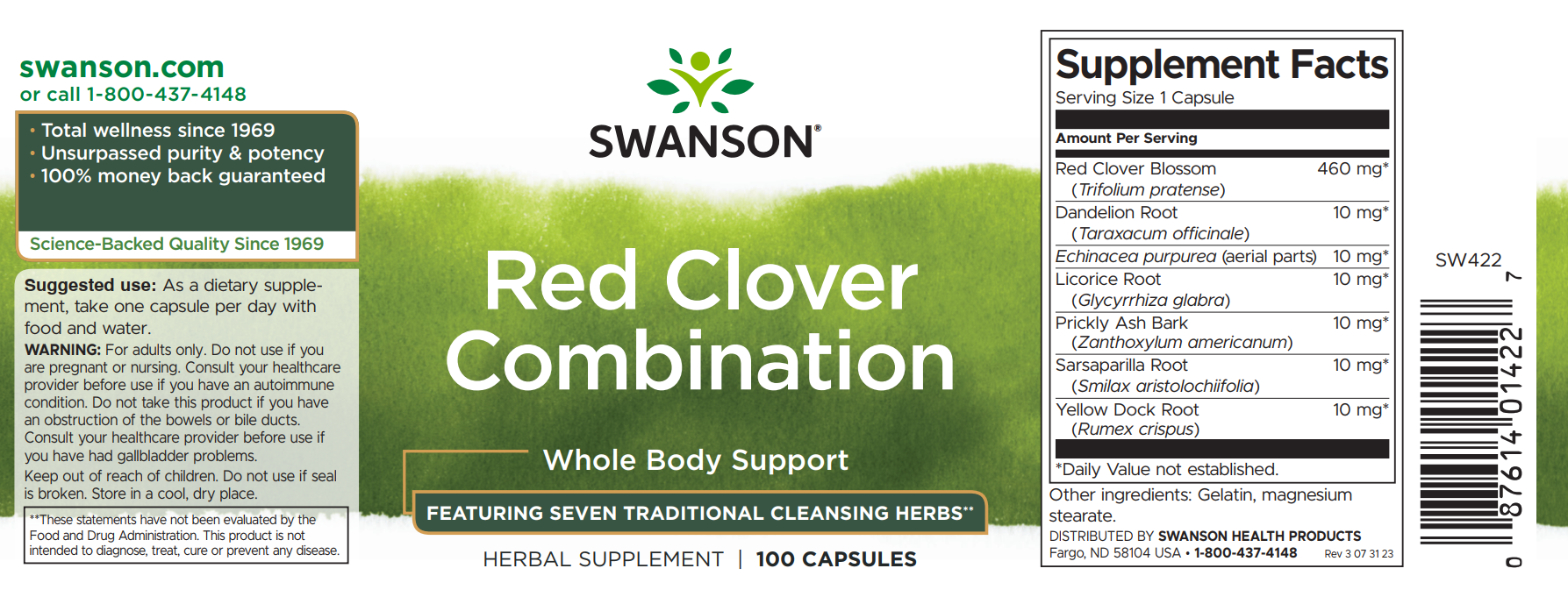Specially formulated to promote the flushing of toxins out of the body and strengthen the immune system at the cellular level, Swanson Red Clover Combination combines nine herbs with cleansing action, including red clover blossom,dandelion root, echinacea leaves, liquorice root, peach bark, plantain leaves, prickly ash, sarsaparilla root and yellow dock root.