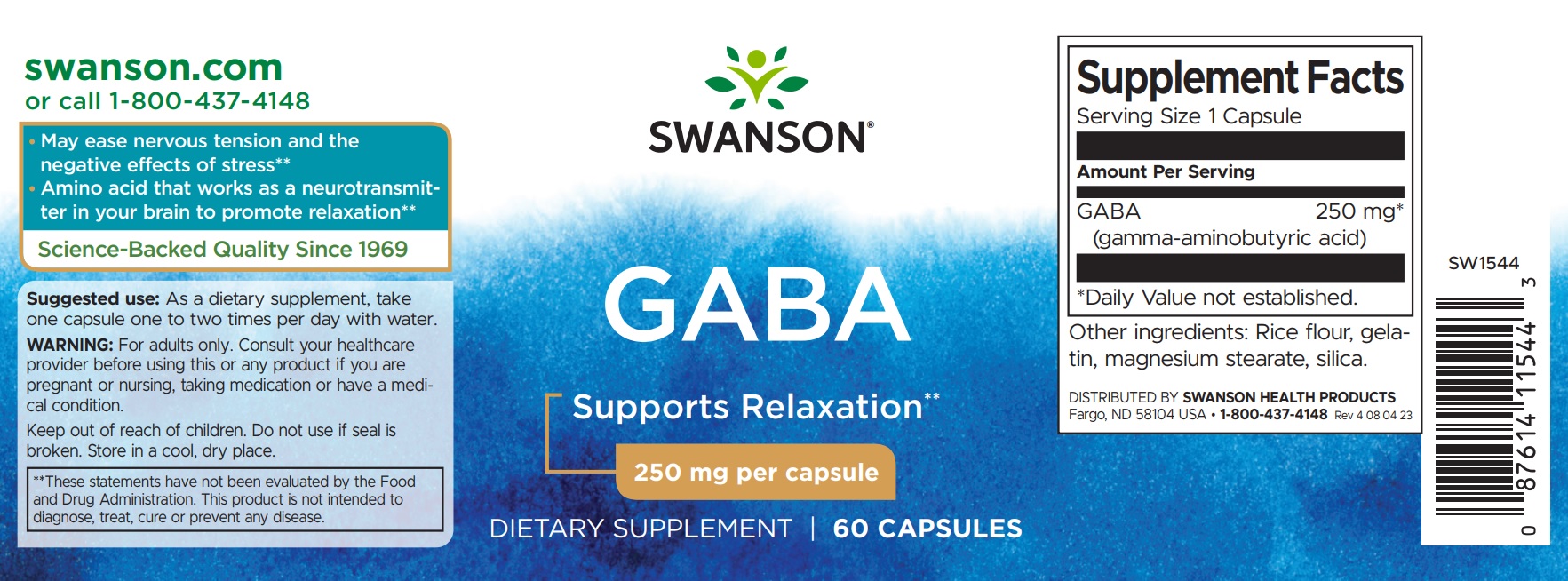 Restless and counting sheep? Take a chill pill! Stress can not only disrupt the flow of our daily lives, it can threaten the nervous system as it depletes the body of its precious stores of B vitamins. Help stay relaxed with the calming benefits of Swanson GABA. Manufactured in the brain, GABA plays an important role in the brain's reaction system by helping us adapt and react positively to stress. Our low-dose formula delivers 250 mg of GABA, offering maximum flexibility for the challenges of modern life.