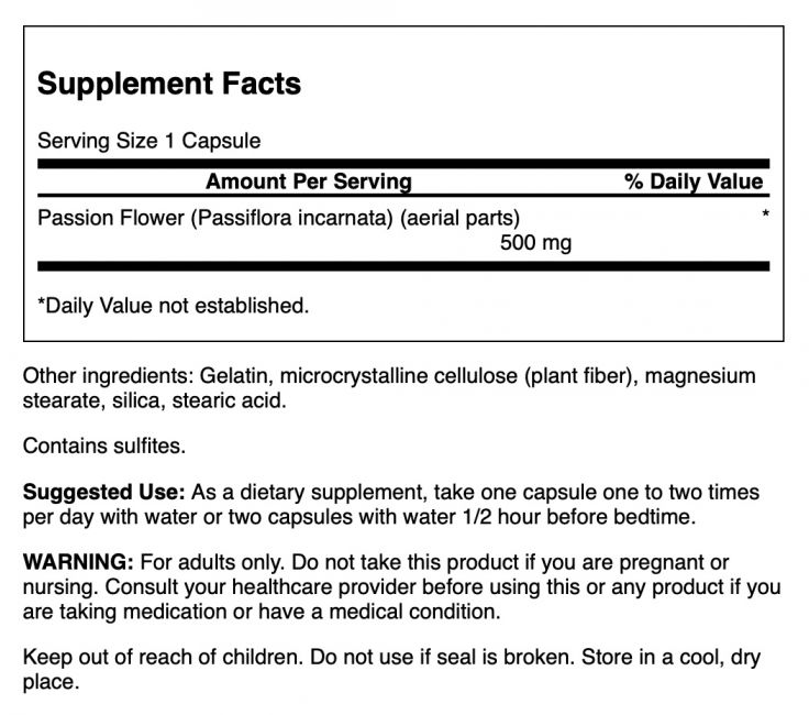 | Passion Flower (Passiflora incarnata) (aerial parts) | 500 mg | * |