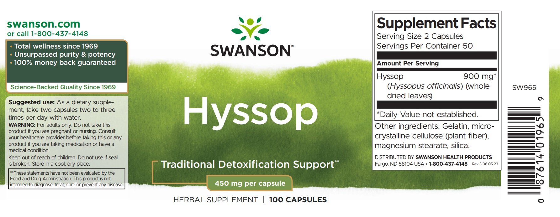 An evergreen perennial herb native to southern Europe and central Asia, Swanson Hyssop is loaded with whole body benefits. A terrific wellness tonic, hyssop also supports the digestive system. Each two-capsule serving delivers 900 mg of hyssop powder.
