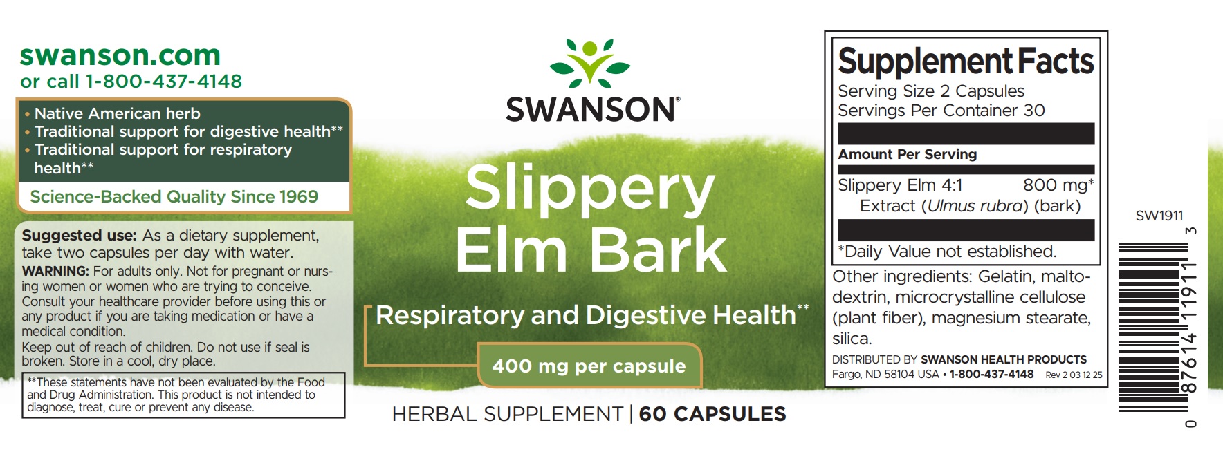 A popular Native American herb, Slippery Elm Bark has been used for a variety of health applications but is best known as a favorite for respiratory and gastrointestinal health. Swanson Slippery Elm Bark soothes the mucous membranes of the throat and bronchial passages to promote a healthy respiratory system. Each capsule delivers 400 mg of slippery elm bark powder.