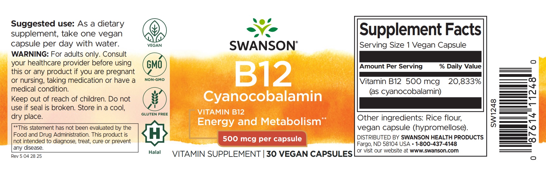 Vous aide à se sentir plus energetic. Joue un rôle clé dans la formation des globules rouges qui transportent l'oxygène vers les différentes parties du corps. Se soutient la santé cardiovasculaire par l'homocystéine neutralisant. Promouvoir l'énergie et la santé cardiovasculaire naturellement avec Swanson vitamine B-12! Cette vitamine essentielle aide à la formation des globules rouges qui fournissent l'oxygène à toutes les parties du corps, qui à son tour favorise l'énergie. Il prend également en charge la santé cardiovasculaire en travaillant avec de la vitamine B-6 et l'acide folique pour aider à neutraliser l'homocystéine nuisible. Bien adéquate B-12 l'apport est important pour tout le monde, la supplémentation peut être particulièrement utile pour certaines personnes parce que la vitamine se trouve principalement dans les aliments d'origine animale.