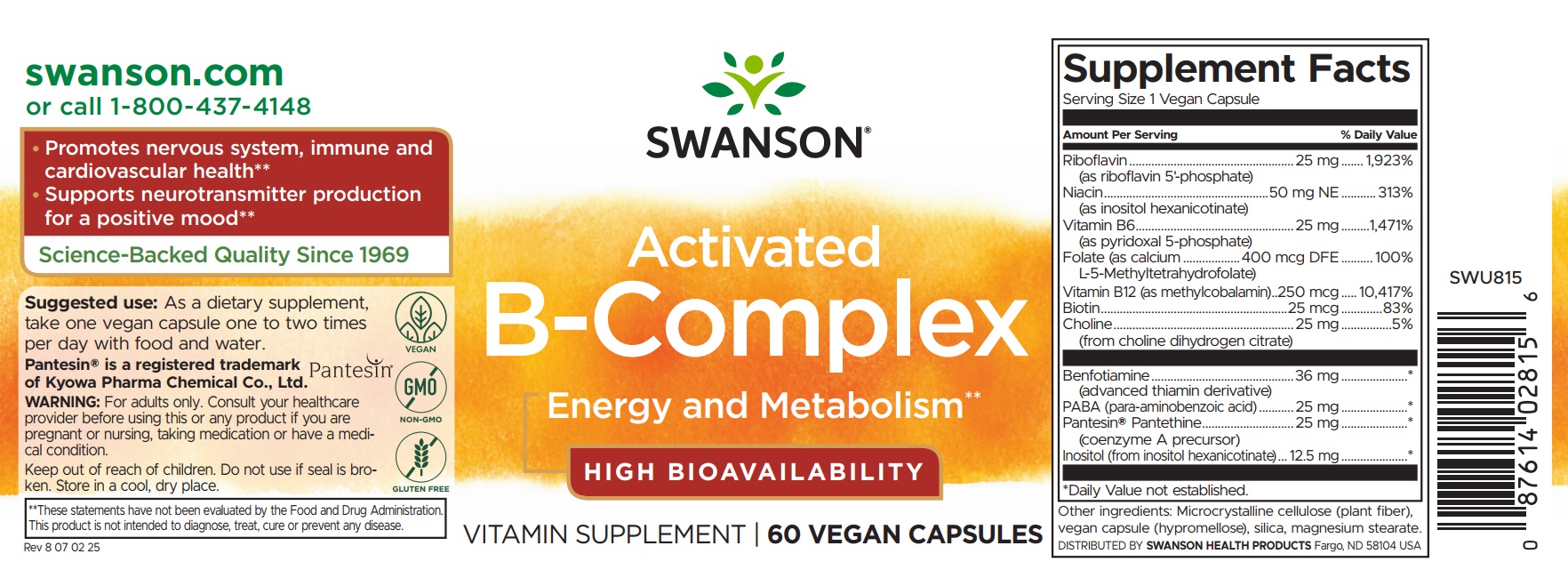 Swanson Ultra® set the standard for advanced B-vitamin supplementation with the original Activated B-Complex. Now by popular request, we've developed a lower-potency version of our best-selling formula that is focused on optimized bioavailability. Both formulas feature the same advanced forms of B-vitamins, including benfotiamine (thiamin/vitamin B1), pyridoxal 5-phosphate (P5P/vitamin B6), methylcobalamin (vitamin B12), patented Pantesin® (pantethine) and 5-methyltetrahydrofolate (folate). These superior forms offer higher bioavailability for reliable supplementation.