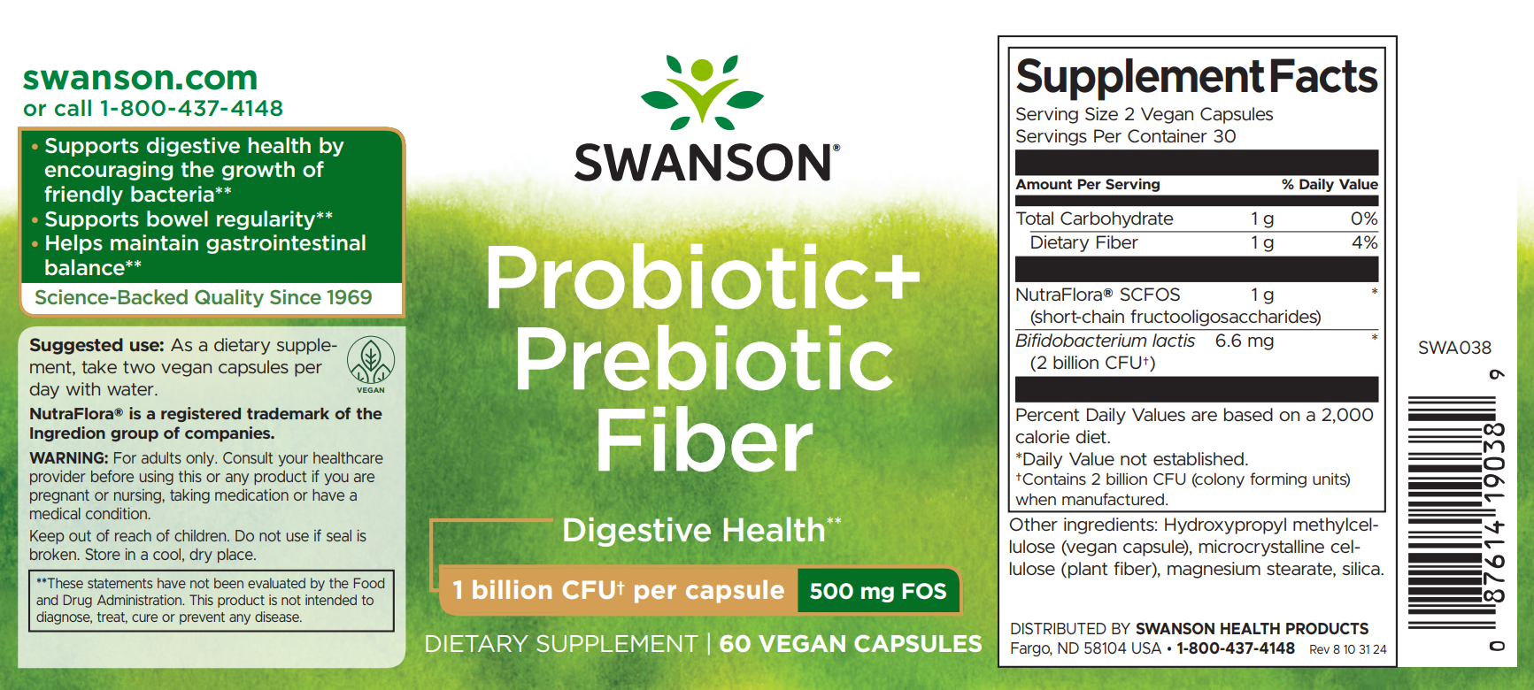Swanson Probiotic+ Prebiotic Fiber helps support digestive health and promote a healthy microflora. Your digestive system has a huge impact on your overall health. One of the easiest ways to nourish your digestive system is with a probiotic. Probiotics are friendly bacteria that nourish your gut and digestive system. They help promote digestion and support immune system health. Prebiotics are food for the probiotics to help them survive and multiply in your body. A healthier inside means a happier outside. Swanson Probiotic+ Prebiotic Fiber for Friendly Flora Support contains 1 billion CFU of Bifidobacterium lactis, a species that has been well-researched for promoting intestinal and immune health. Along with friendly bacteria, this supplement also contains the prebiotic fiber NutraFlora®. The fructooligosaccharides (FOS) in NutraFlora help create a favorable environment for the probiotics so they can thrive. It’s the perfect probiotic and prebiotic supplement.