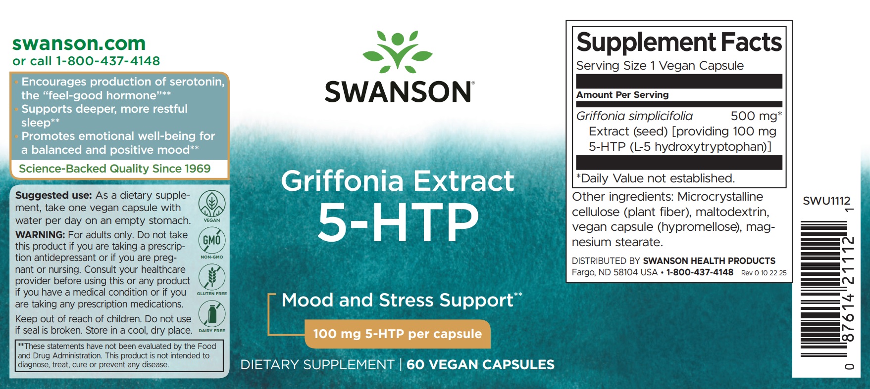 Get high-powered support for your mental and emotional wellbeing with Swanson Griffonia Extract 5-HTP. A unique compound naturally sourced from Griffonia simplicifolia seeds, 5-HTP works within the body to promote healthy levels of serotonin. Often called the “feel-good hormone,” serotonin is a neurotransmitter involved in the modulation of mood, cognition, reward, learning, memory, sleep and numerous other physiological processes. Our veggie capsules are a safe, effective way to reset your sleep schedule and enhance your emotional well-being.