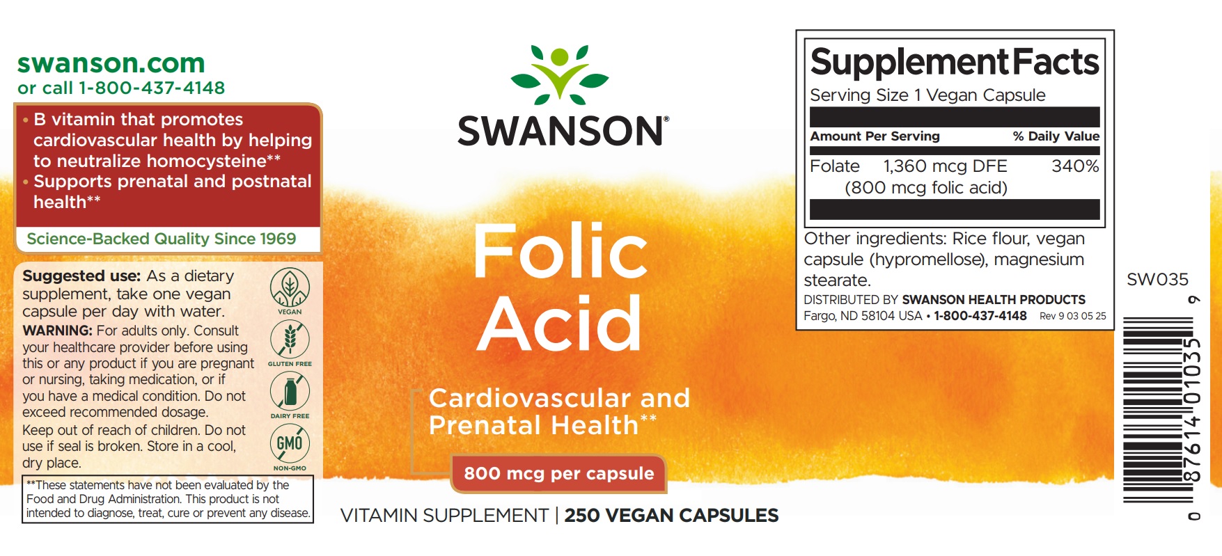 | Folate | 1,360 mcg DFE (785 mcg folic acid) | 340% |